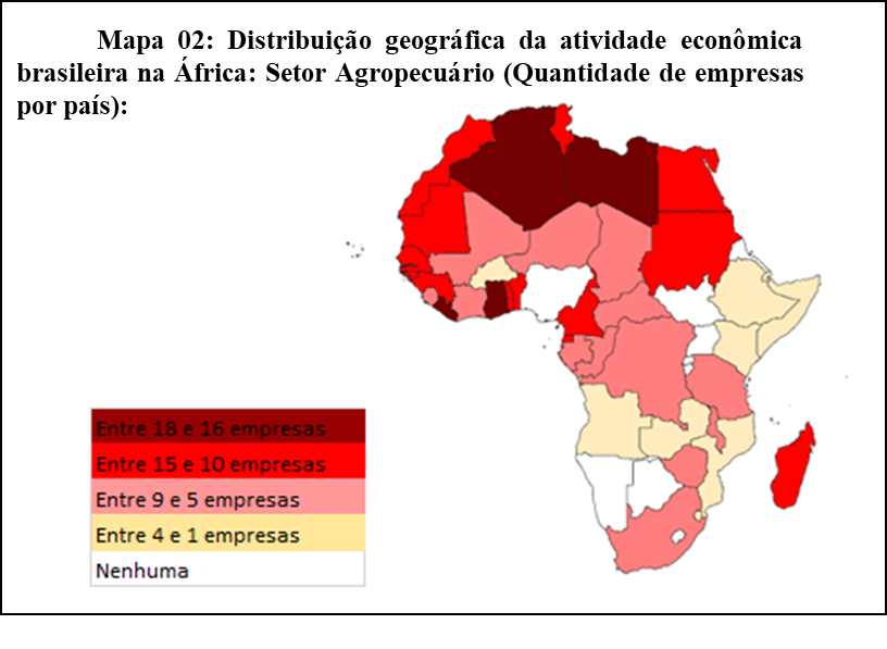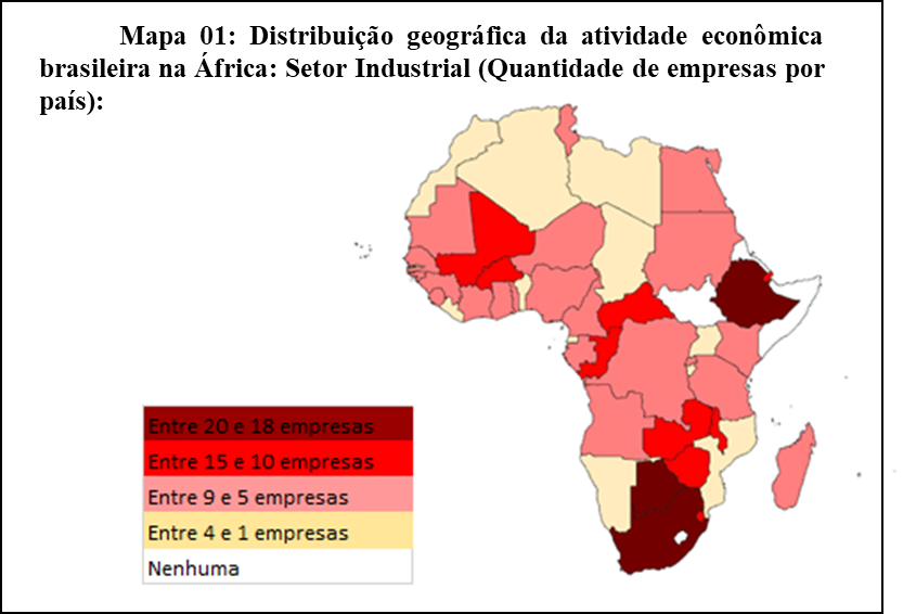 É notável o predomínio da presença da burguesia agropecuária, sobretudo no Norte da África, países de raízes árabes que são costumeiros consumidores do frango brasileiro, vide Egito, Argélia e Líbia. Por outro lado, as atividades industriais estão melhor distribuídas pela África subsaariana parte em que o maquinário brasileiro é elementar, por exemplo, para a cooperação técnica agrícola. O mapeamento da presença industrial brasileira mostra que de fato a África do Sul é um mercado diferenciado para o país, onde pelo menos 8 das multinacionais ranqueadas pela FDC ali se encontram: Weg, Random, Embraer, Marcopolo, Intercement, Iochpe-Maxion, Tupy e Magnesita, através de operações ou de exportações.