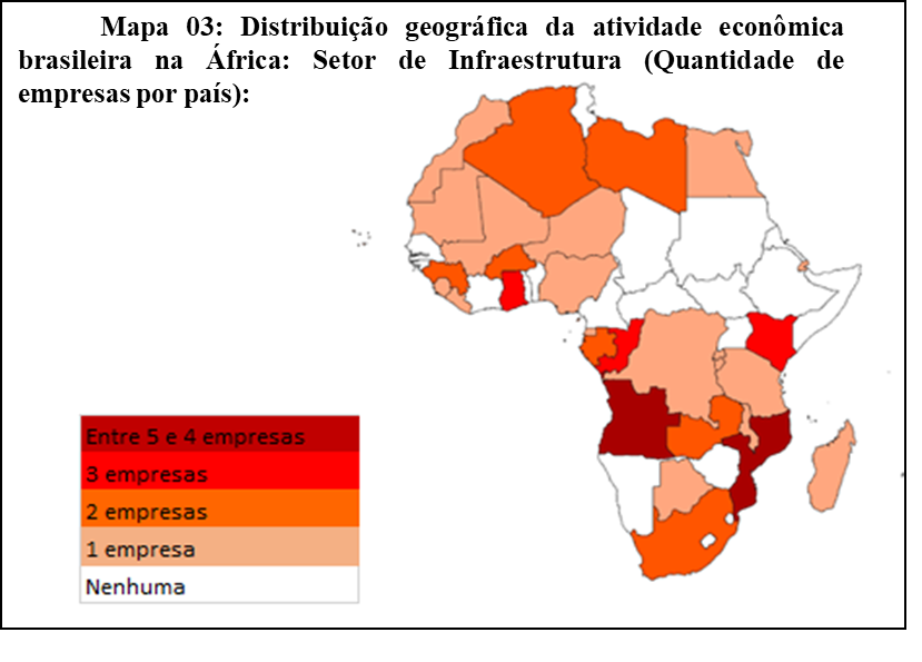 Já as empresas de infraestrutura se destacam na costa atlântica e nos países de língua portuguesa, bem como os outros dois setores anteriores, em especial Angola e Moçambique, os parceiros mais tradicionais do Brasil no continente, como é possível ver no mapa abaixo. A Odebrecht, o caso mais relevante de internacionalização via continente ultrapassa a simples atuação na construção civil, está na gestão de supermercados, mineração e agropecuária (ZANINI, 2017). A ida da empresa para a África resulta do período anterior de desenvolvimentismo, entre 1970 e 1980 e ganhou novo impulso durante os governos do PT.